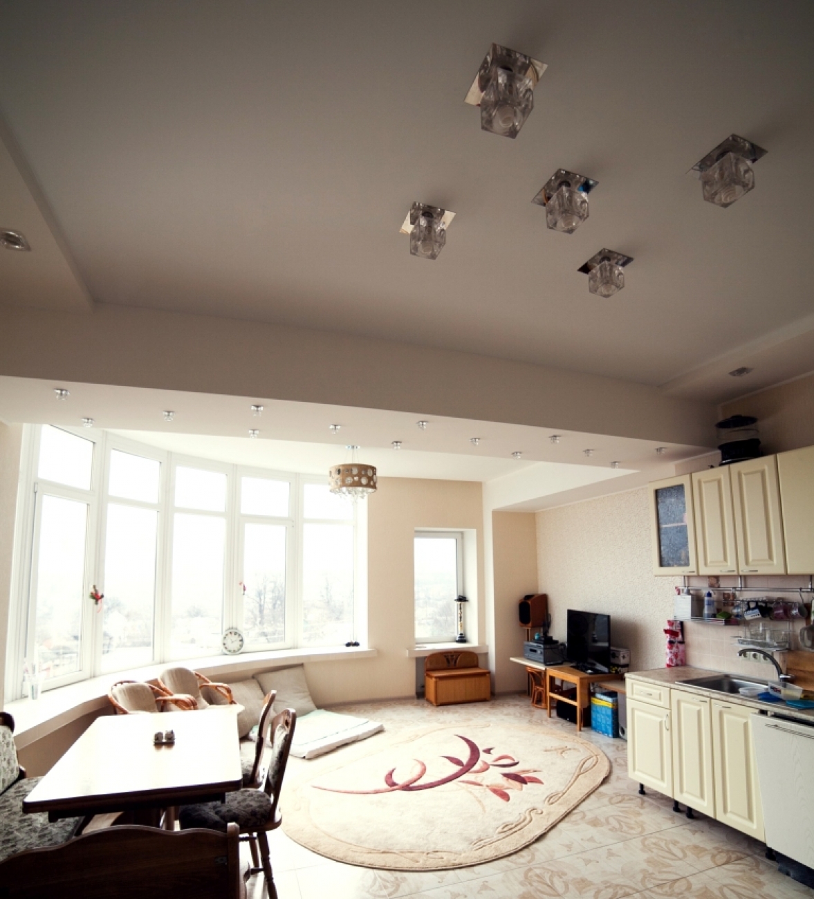 - Want to quickly and inexpensively align all the ceilings in the house, then use exactly matte white films. Buy this coating is not difficult, but its cost will pleasantly surprise you.